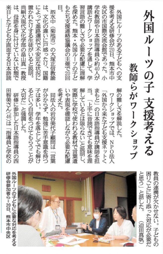 9月20日に行われました「熊本・外国ルーツの子ども支援連絡協議会」の研修会の様子が、熊本日日新聞(9月29日朝刊)にて掲載されました!